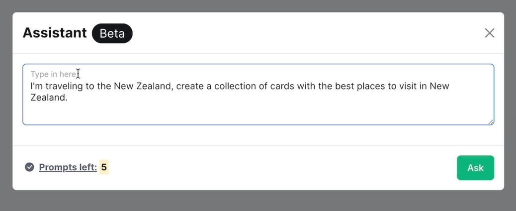 Ask the AI assistant to create a collection of the best places to visit (e.g., “Create a collection of cards with the best places to visit in New Zealand”).